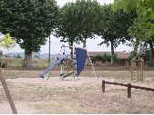 Aire de jeux pour enfants avec structure multi-activités métallique. Abords arborés, plantations de jeunes arbres tuteurés.