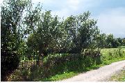 Clôture en bois doublée d'arbres, en bordure d'un fossé longeant une route de campagne.