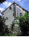 Pignon restauré d'une maison à Saint Aventin : façade crépie aux 3/4, une partie en bardage bois. Petites fenêtres. Le bas du mur en pierre a été conservé, la démarcation avec le crépi étant travaillée selon une ligne irrégulière.