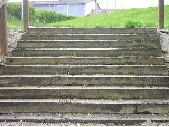 1 vue d'un escalier avec traverses en bois de 10 marches à Saint-Géniez-Bellevue, pays toulousain. Escalier construit sur un chemin piéton de gravier visible au premier plan et que l'on devine au-dessus de l'escalier. Sur les côtés de l'escalier, présence de poteaux de bois soutenant la main-courante. Au-dessus de l'escalier, pelouse sur des buttes de part et d'autres du chemin (terrain de sport). En fond, présence d'une structure métallique et à sa droite, d'un bâtiment dont on ne voit que la toiture en tuile (gymnase?).
