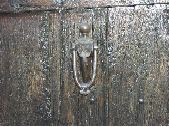 Prise de vue d'un marteau de porte à Loubressac, Lot. Marteau de porte en fer forgé sur une porte en bois.