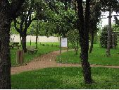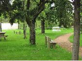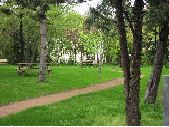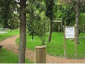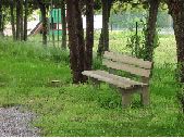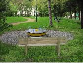 7 prises de vues du jardin d'enfants de Saint-Géniez-Bellevue. Présence sur toutes les images d'un chemin en sable passant au milieu d'espace vert avec pelouse et arbres d'ornements. Sur certaines images, présence de bancs en bois installés dans l'herbe. Présence de jeux pour enfants sur certaines images dont une toupie sur un sol en gravier.