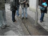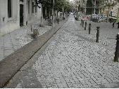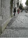 3 vues d'un caniveau dans les rues de Gérone, Espagne. Caniveau dallé, sol autour du caniveau pavé et dallé, présence de mobilier urbain avec bancs en bois, éclairage public et poubelles.