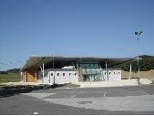Au premier plan, parking bitumé. Au second plan espace sablé faisant le tour du dojo. Façade du bâtiment en enduit et bardage bois. Au centre de la façade, une baie vitrée. Toiture du bâtiment en métal soutenue par de nombreux piliers métalliques.