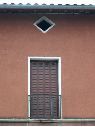 Prise de vue d'une partie d'une façade à Saint-Sulpice, Volvestre. Façade recouverte d'un enduit de couleur. Au centre de l'image, deux ouvertures sont alignées, une en dessous de l'autre. Le percement le plus bas est une porte-fenêtre donnant sur un petit balcon équipé d'un garde-corps en fer forgé. Volets de la porte- fenêtre en métal. Les deux ouvertures sont dans des encadrements en béton blanc. Toiture du bâtiment en tuile.