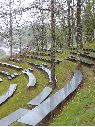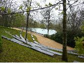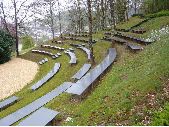 3 prises de vues de tribunes au jardin imaginaire de Terrasson, Lot. Tribunes en métal installées sur une colline herbeuse avec des arbres d'ornements. Pour atteindre les différents niveaux des tribunes, escaliers avec marches en métal. Au pied des tribunes, espace avec gravier au sol. Sur la dernière image, espace en gravier prolongé par une allée. Sur le côté de l'allée garde-corps en fer forgé.