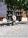 1 prise de vue d'un platane à Montech, Tarn-et-Garonne. Platane avec tronc déformé planté en bord de voirie bitumée. Au pied de l'arbre une poubelle métallique. En fond, un habitat collectif avec façade enduite comportant des balcons avec garde-corps en fer forgé et des percements vitrés.
