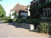1 prise de vue d'un mur de pierre à hauteur d'assise en délimitation d'un espace public à Loubressac, Lot. Muret en bordure d'une voirie bitumée. Derrière le muret, de nombreuses plantes ornementales. Dans le fond de l'image, les façades de plusieurs maisons individuelles avec façades enduites et toiture en tuile. La façade sur la droite de la prise de vue est envahie par des glycines.