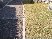 1 price de vue d'une allée en gravier avec bordure en pavé et béton et longée par de la pelouse.