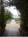 1 prise de vue de cheminement piéton avec un contraste entre espace fermé et ouvert à Saint-Jacques-de-la-Lande, Ille-et-Vilaine. Cheminement dallé en pierre traversant une allée couverte de sable puis qui continue en cheminement bétonné. Sur les bords de l'allées jardinières contenant de grandes plantes ornementales. Au niveau de l'espace ouvert, sur les bords pelouse avec arbre d'alignement et plante ornementale.