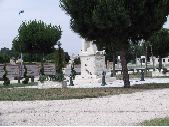 1 prise de vue d'un monument aux morts à Portet-sur-Garonne, pays toulousain. Monument aux mors entouré par une chaîne attachée à des plots métalliques. Autour du monument aux morts, pelouse, arbre d'ornement et jardinière avec fleur.