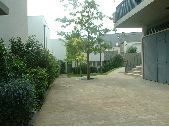1 prise de vue d'une cour d'immeuble bétonnée à Servon-sur-Vilaine, Ille-et-Vilaine. En fond de la cour d'immeuble des plantes ornementales. Sur la cour présence d'arbres d'ornement et en fond de la photographie pelouse visible. Pour encadrer la cour, immeuble avec façades enduites.
