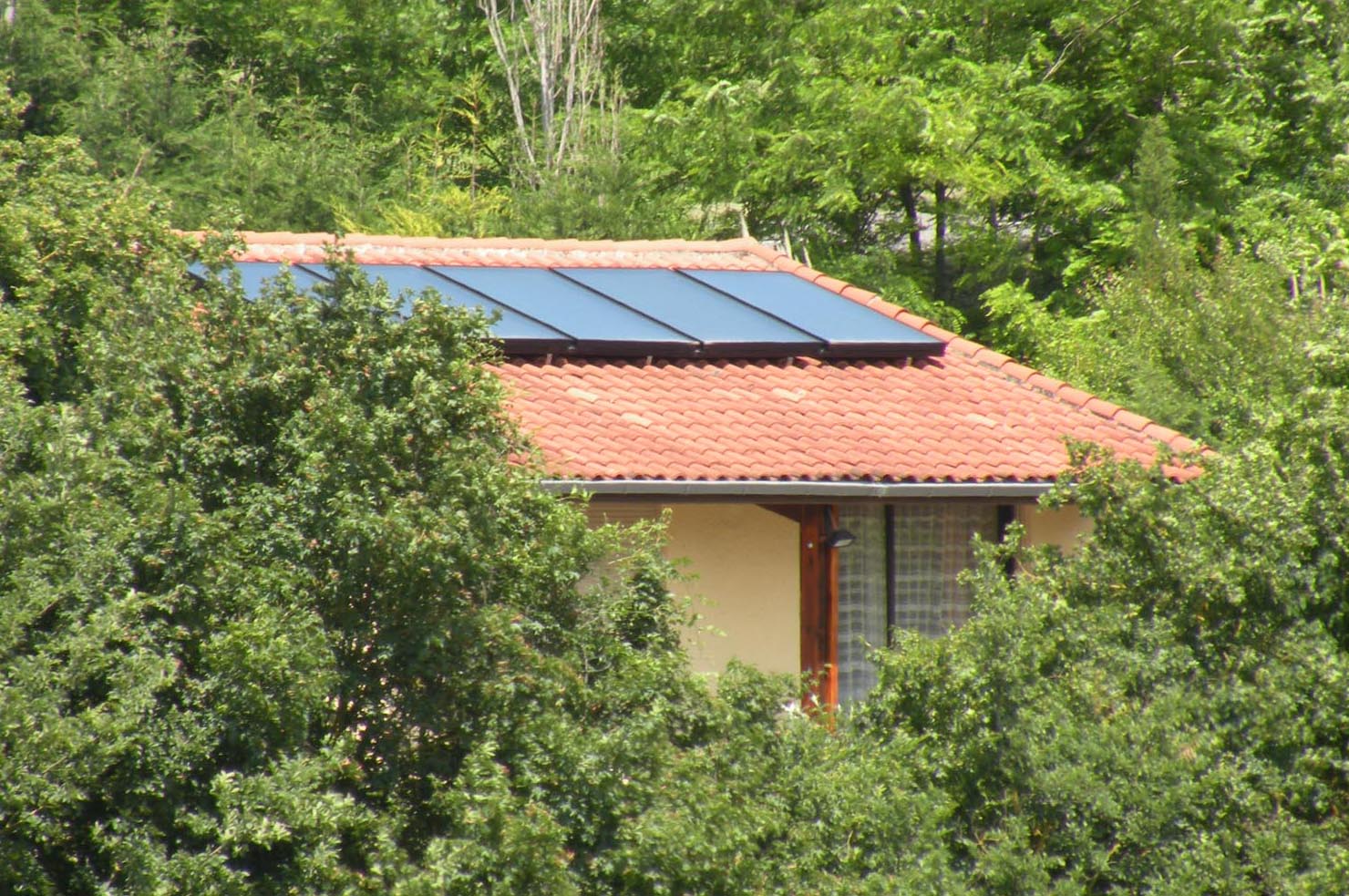 1 prise de vue du toit d'une maison sur lequel se trouvent des panneaux solaires.
