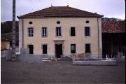 Ces diapositives traitent de la construction de la Mairie de Saint-Marcet. Il s'agit de l'aménagement extérieur du bâtiment. La diapositive 3 montre un bâtiment en pierre et bois et un espace de graviers devant.
