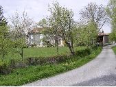 Haie bocagère en limite d'un pré, bordant une route de campagne. Maison d'habitation et grange en arrière-plan