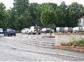 1 vue d'un emmarchement à Valence d'Agen, Tarn-et-Garonne. L'emmarchement part d'un trottoir et mène à une esplanade proche d'un parking. Trois marches en granit comme le nez du trottoir. Le sol et la voierie au premier plan sont dallés en pierre. Le sol du parking est en gravier. A droite de l'escalier un muret de pierre avec des briques à son son sommet et devant lui, un bac à fleur bétonné avec le sommet en brique. Sur l'esplanade, un arbre a érté planté dans un carré de briques. En fond, de nombreux arbres d'ornements. En fond, sur la droite de la photo, présence d'un bâtiment bétonné avec une toiture en tuile ainsi que des ouvertures avec volets bleus en bois.