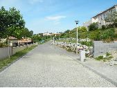 1 prise de vue d'un lotissement construit sur une colline à Saint-Pierre-de-Lages, Coteaux nord Lauragais. Au centre de l'image une voirie bitumée longée sur sa gauche par un trottoir de pelouse avec arbre d'alignement et à droite par un trottoir bitumé avec éclairage public. Sur la droite de la prise de vue, un mur de soutènement en pierre surmonté d'un grillage. Au-dessus jardin avec pelouse et plante ornementale. Sur la butte maison enduite avec un balcon. Sur la gauche, muret enduit surmonté d'une grille délimitant le terrain d'une maison individuelle de type néo-régional. Dans le fond de la prise de vue, d'autres maisons individuelles sont visibles.