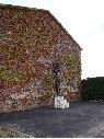 1 prise de vue d'une façade en appareillage galet et briques végétalisée par du lierre au cimetière de Castelginest. Au pied de la façade du bitume et en fond, une haie.