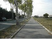 1 prise de vue de la traversée bitumée du quartier Pont Richard de Revel, Lauragais. Traversée avec voirie et contre allée séparées l'une de l'autre par une plate bande avec pelouse et platane alignés. Sur la droite de l'allée, vaste étendue herbeuse.