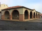 1 prise de vue d'une halle de Palaminy, Volvestre. Le long des deux façades avant de nombreuses arches sont visibles. Façade en enduit et brique. Les arches sont dans des encadrement brique. Toiture de la halle en tuile. Autour de la halle, voirie bitumée.