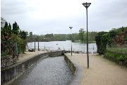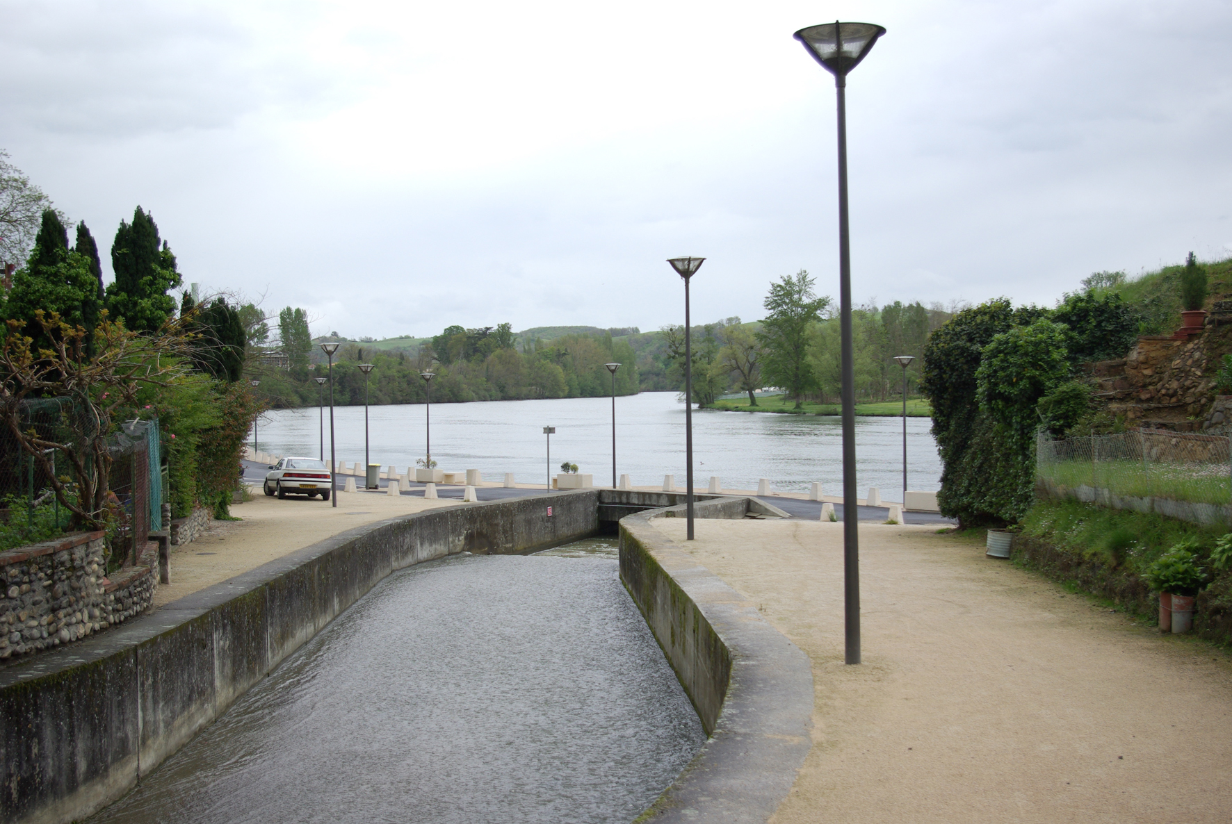 1 prise de vue à la confluence de l'Hourride et de la Garonne à Cazères. Au premier plan berge aménagée avec mur de soutènement en béton surmonté par des allées de sable équipées de lampadaires et de plots. Au second plan, une passerelle sur laquelle passe une allée bitumée. En fond de l'image berge avec pelouse, arbre d'ornement et boisement. Sur la droite butte avec herbe et plante ornementale présence d'un grillage sur la butte. Sur la gauche de la photographie muret en galet avec couronnement de brique surmonté par un grillage.