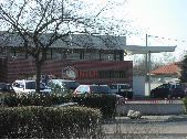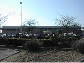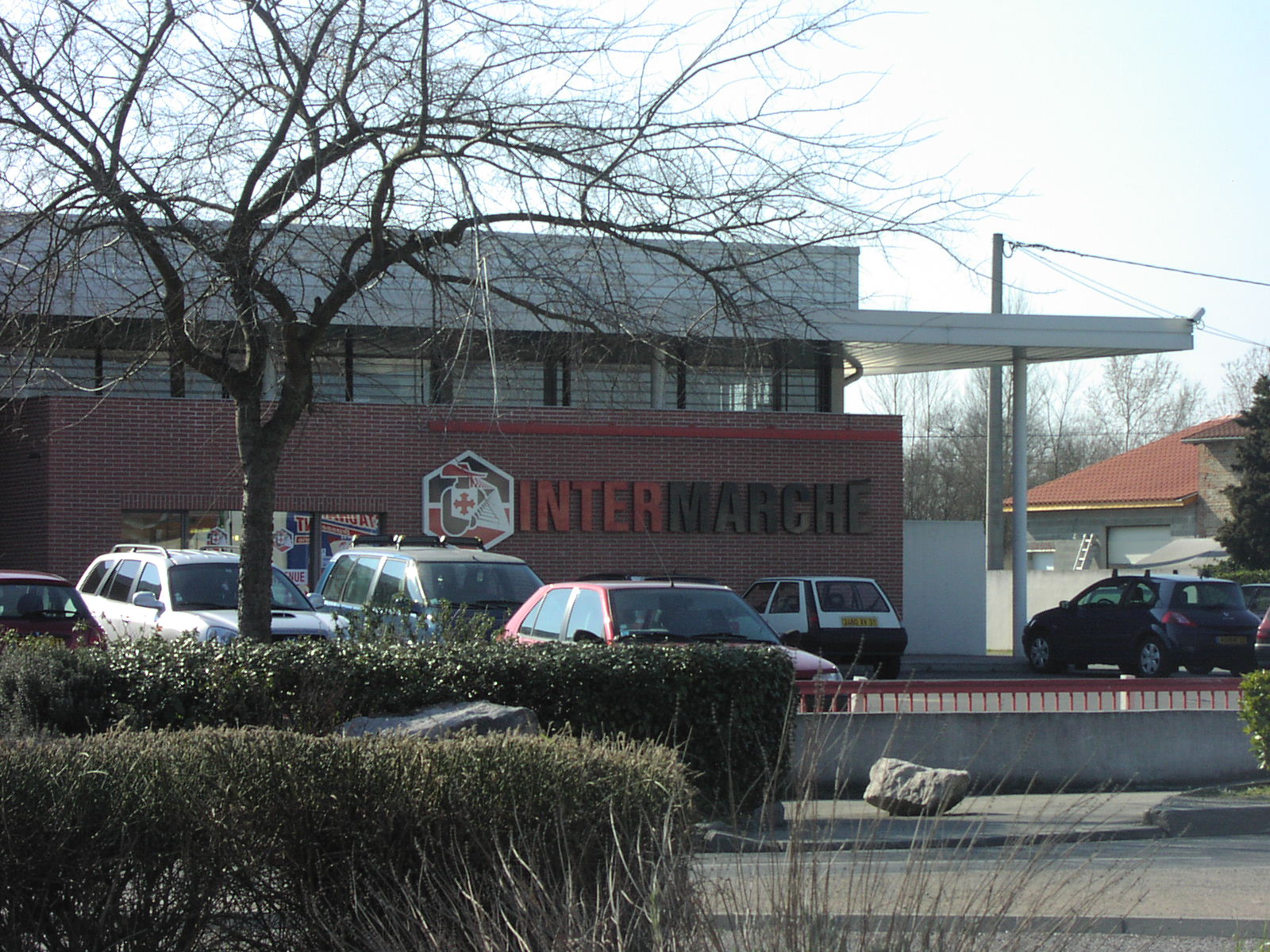 Vue de la façade du supermarché l'hivers. Au premier plan système d'arrosage integré, lavande en mauvais état, haie de persistant et parking complet