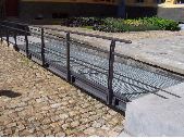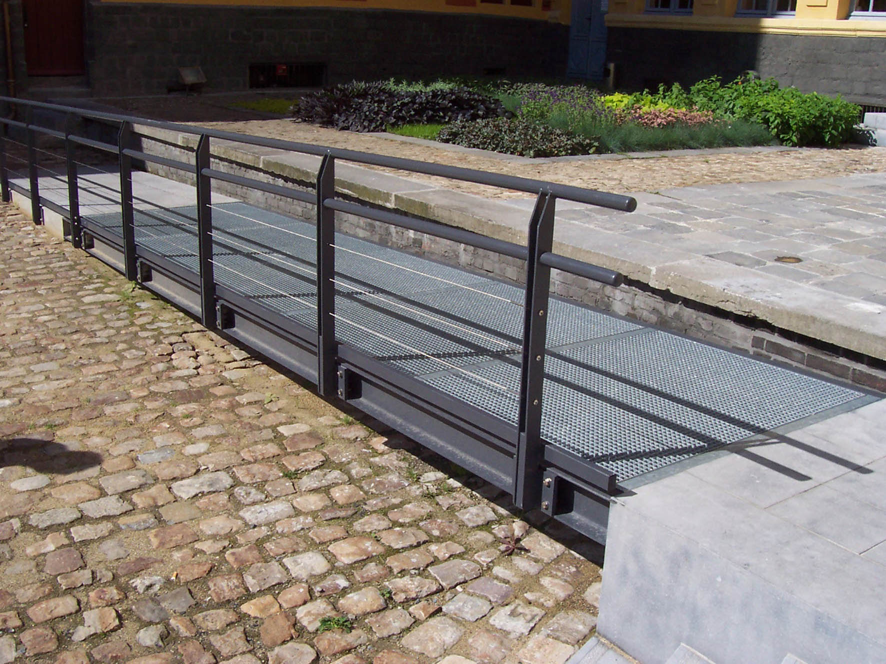 Rampe d'accès pour personne handicapée, structure et ossature métallique. Rambarde en acier peint.