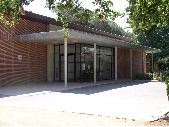 Auditorium de Colomiers, pays toulousain avec façade en brique sauf au niveau de l'entrée avec façade en enduit avec extension en baie vitrée. En avant de la baie vitrée, un auvent avec toit en béton soutenu par quelques piliers en béton. Faisant le tour de l'auditorium, une allée en béton désactivé et bitume. Toiture du bâtiment en tuile. Longeant l'auditorim, pelouse et plantes d'ornements.