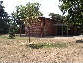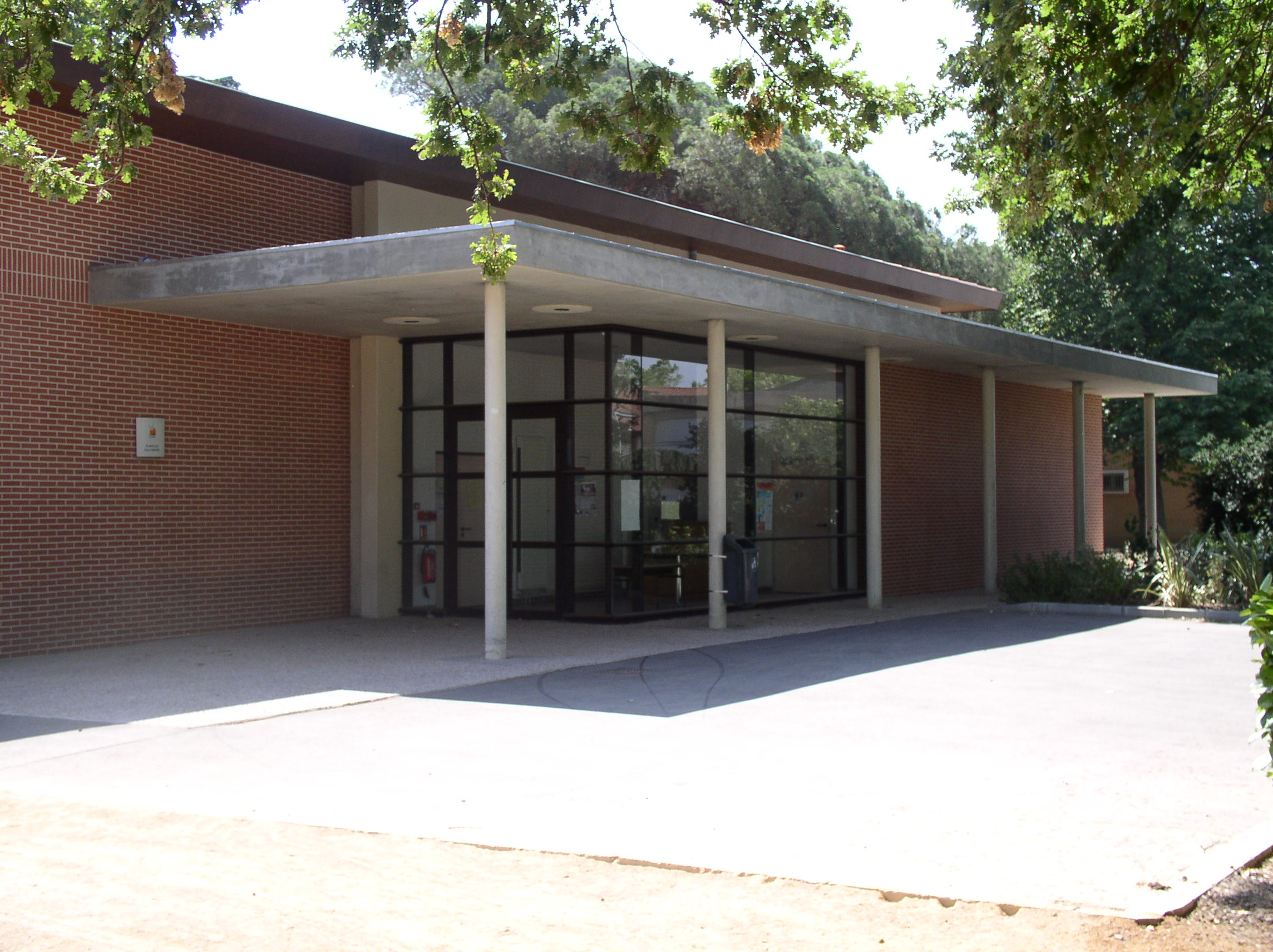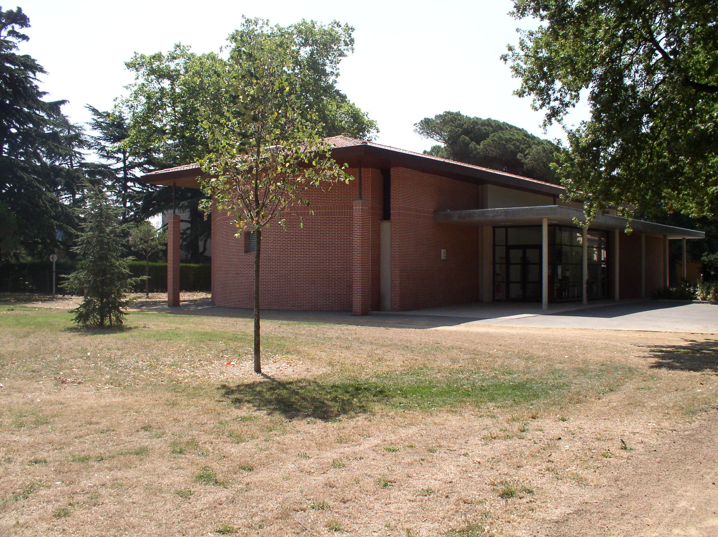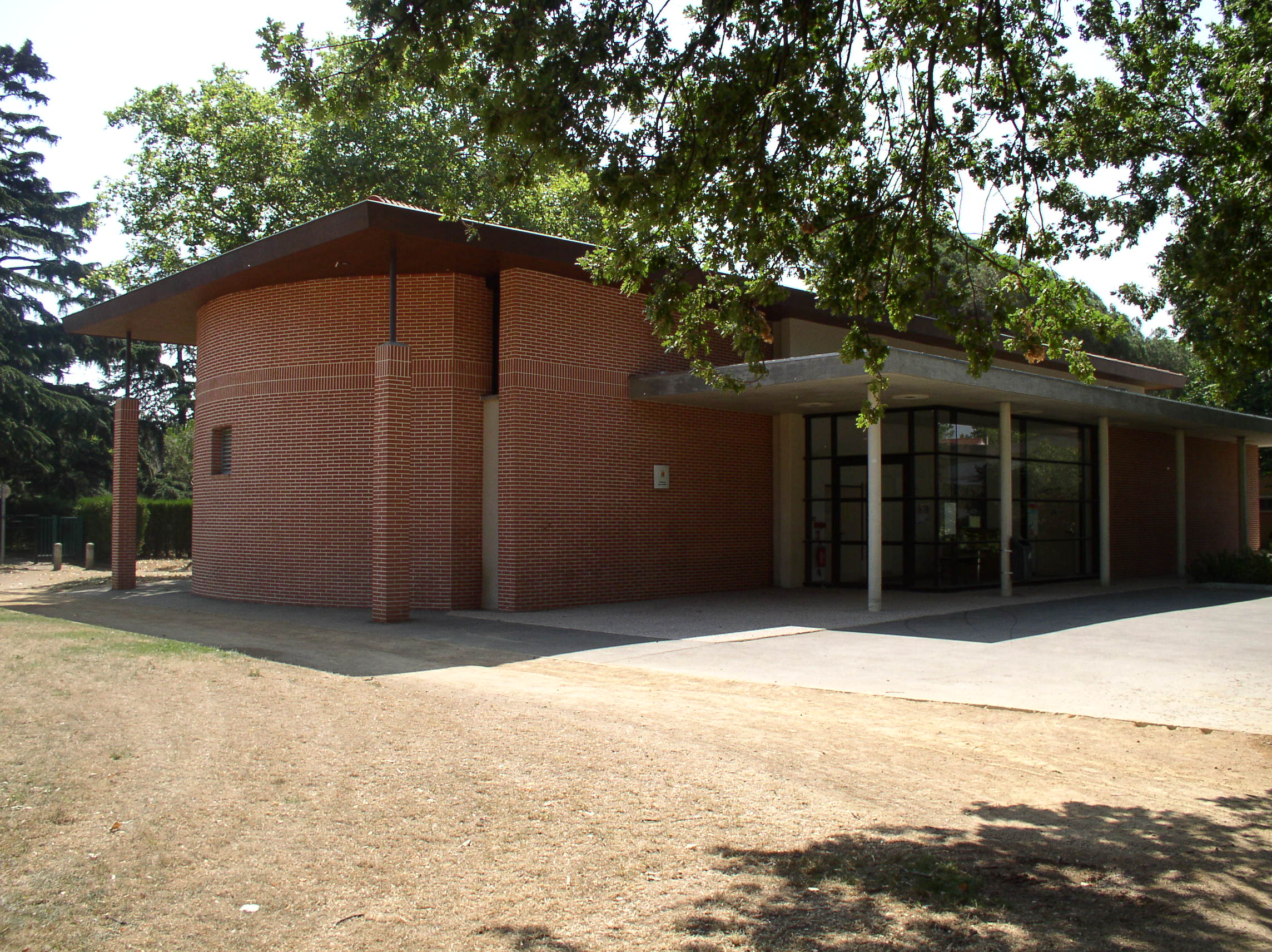 PAYS TOULOUSAIN ; Colomiers ; AUDITORIUM ; BRIQUE ; tuile ; baie vitrée ; PELOUSE ; Plante ornementale ; ALLÉE ; BITUME ; béton désactivé ; enduit ; AUVENT