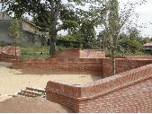 1 prise de vue de nombreux mur et murets en brique foraine sur une placette en sable à Castelnau-d'Estrefonds, pays toulousain. Présence d'arbres d'ornement et de diverses plantes.