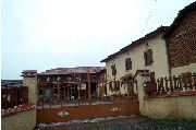 1 prise de vue d'une ferme commingeoise située à Balesta. Portail d'entrée en fer forgé en premier plan. Clôture maçonnée surmontée d'une clôture en bois. En arrière plan, on voit la maison et le bâtiment agricole.