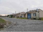 1 prise de vue d'un lotissement d'un centre d'aide par le travail. Route bitumée desservant des maisons individuelles de type néo-régional (enduit-tuile). Présence d'un abri bus en bord de voirie. Des lampadaires sont présent le long de la route.