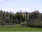 Vue d'ensemble du parc public d'Eoux (Comminges), arbres en fleurs, cyprès, conifères..... Pelouse au 1er plan.