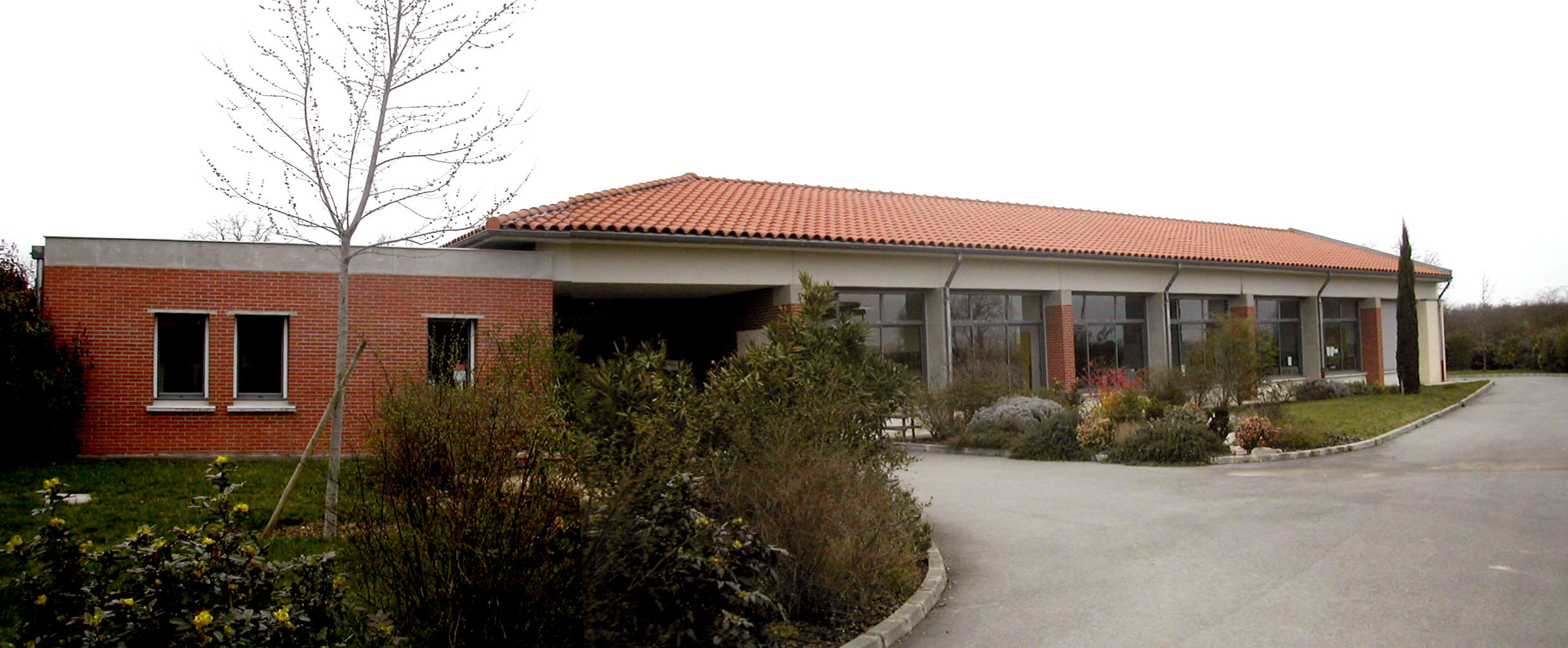 Villaudric ; ÉCOLE ; VOIRIE ; Plante ornementale ; FACADE ; BRIQUE ; enduit ; baie vitrée ; TOITURE ; tuile ; OUVERTURE ; ACIER ; ossature ; MÉTAL