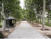 5 photgraphies de l'entrée du parc du ramier à Blagnac, pays toulousain. Grande allée avec sable au sol. Juste à l'entrée devant le cabanon en bois du gardien puis entre les bancs placés à intervalle régulier le long de l'allée, au sol dallage en pierre. Cabanon du gardien placé à l'entrée du parc, façades en bois et toiture en tôle. Arbres d'ornements plantés à intervalle régulier le long de l'allée. Celle-ci est bordée par des espaces vert avec pelouse et d'autres arbres d'ornements.