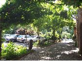1 prise de vue d'une tonnelle envahit de plantes grimpantes à Albi, Tarn. Au sol allée, dalée en pierre. Tonnelle installée en bordure d'un parking.